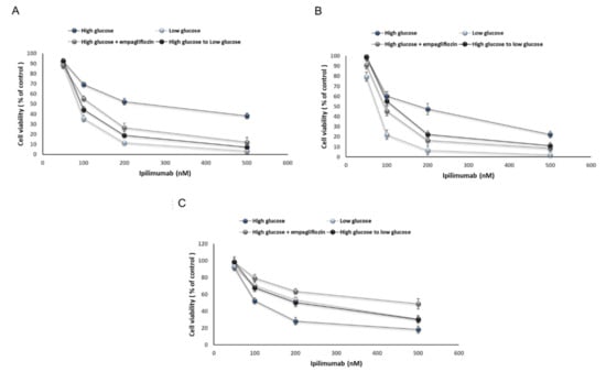 Cell viability of MCF-7 (A) and MDA-MB-231 (B) cells after 72 h of incubation with ipilimumab under different condition (high glucose; low glucose; high glucose + empagliflozin at 500 nM; switch high glucose to low glucose); (C) Cell viability of AC16 cells after 72 h of incubation with ipilimumab under different condition (high glucose; low glucose; high glucose + empagliflozin at 500 nM; shifting from a high glucose to low glucose). Error bars depict means ± SD (n = 3). Statistical analysis was performed using paired t-test.