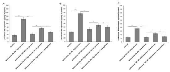 To evaluate the effects of hyperglicemia on lipid metabolism transduction signal pathways during ipilimumab exposure in cancer cells and cardiomyocytes, we quantified the production of leukotrienes B4 (Figure 3). After incubation with ipilimumab under hyperglicemia, MCF-7 cells increased production of leukotrienes compared to low-glucose (125.6 ± 7.4 vs. 43,3 ± 5.5 pg/mg of protein, paired t-test p < 0.001, n = 3) (Figure 3A); shifting from high glucose to low glucose (73.5 ± 6.1 vs. 125.6 ± 7.4 pg/mg of protein, paired t-test p < 0.001, n = 3), as well as the treatment with empagliflozin under hyperglicemic conditions (53.3 ± 3.3 vs. 125.6 ± 7.4 pg/mg of protein, paired t-test p < 0.001, n = 3) reduced significantly the production of leukotrienes indicating anti-inflammatory effects (Figure 3A). A different picture was seen in MDA-MB-231 cells (Figure 3B); after incubation with ipilimumab under hyperglicemia, triple negative cells increased production of leukotrienes compared to low-glucose (154.5 ± 8.3 vs. 53,6 ± 3.4 pg/mg of protein, paired t-test p < 0.001, n = 3) (Figure 3A); shifting from high glucose to low glucose (89.9 ± 8.2 vs. 154.5 ± 8.3 pg/mg of protein, paired t-test p < 0.001, n = 3), as well as the treatment with empagliflozin under hyperglicemic condition (80.5 ± 7.6 vs. 154.5 ± 8.3 pg/mg of protein, paired t-test p < 0.001, n = 3) reduced significantly the production of leukotrienes indicating anti-inflammatory effects (Figure 3B). Human cardiomyocytes exposed to ipilimumab under hyperglicemic conditions (74.2 ± 7.4 vs. 27.2 ±5.4 pg/mg of protein, paired t-test p < 0.001, n = 3) increased the production of leukotrienes and these effects were partially reduced after a change to low-glucose (46.6 ± 6.1 pg/mg of protein) and treatment with empagliflozin (29.9 ± 3.3 pg/mg of protein) (Figure 2B).