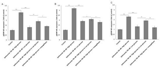 As shown in Figure 5A,B, p65-NF-κB expression was increased by 2.8 and 3.4 times in MCF-7 and MDA-MB-231 cells, respectively, under high glucose and exposure to ipilimumab. This trend was reduced by shifting high glucose to low glucose (−0.9 ± 0.13 for MCF-7 cells; −1.2 ± 0.11 for MDA-MB-231 cells; paired t-test p < 0.001, n = 3 for both) and after administration of empagliflozin (−1.4 ± 0.008 for MCF-7 cells; −1.6 ± 0.03 for MDA-MB-231 cells; paired t-test p < 0.001, n = 3 for both). Additionally, cardiomyocytes exposed to ipilimumab under high glucose increased by 2.3 times the expression of p65-NF-κB compared with untreated cells and shifting from high glucose to low glucose reduced the magnitude of the effects (Figure 5C). These effects indicate anti-inflammatory properties of hypoglicemia and treatment with empagliflozin during treatment with ipilimumab.