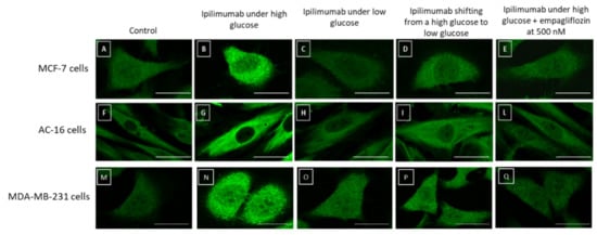 NLRP3 straining (green signals) in MCF-7 (A–E), AC-16 (F–I,L), and MDA-MB-231 cells (M–Q) treated with ipilimumab under high glucose (B,G,N); low glucose (C,H,O); shifting from a high glucose to low glucose (D,I,P), and high glucose + empagliflozin at 500 nM (E,L,Q). Untreated cells with an unrelated control IgG (control) were used as negative controls (A,F,M). Scale bar: 50 µm.