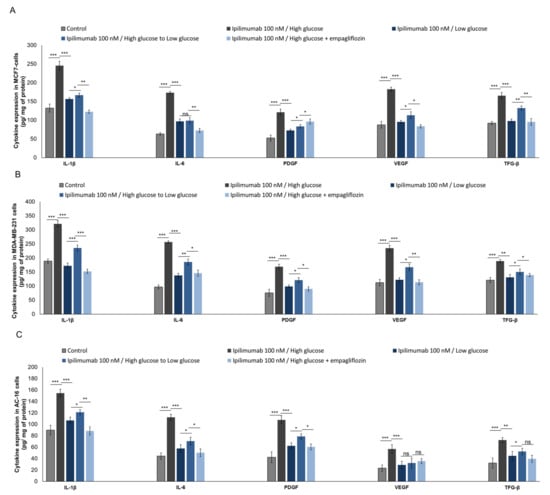 Expression of IL-1, IL-6, PDGF, VEGF, and TGF in MCF-7 (A), MDA-MB-231 (B), and AC-16 cells (C). Cells were treated with ipilimumab mAb for 24 h, in the presence of hPBMCs under different condition (high glucose; low glucose; shifting from a high glucose to low glucose; high glucose + empagliflozin at 500 nm). Error bars depict means ± SD (n = 3). Statistical analysis was performed using paired t-test. *** p < 0.001. ** p < 0.01. * p < 0.05.