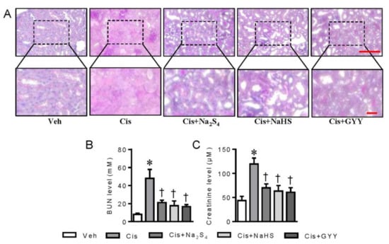 - Liu, M.; Jia, Z.; Sun, Y.; Zhang, A.; Yang, T. A H2S Donor GYY4137 Exacerbates Cisplatin-Induced Nephrotoxicity in Mice. Mediat. Inflamm. 2016, 2016, 1–10. [Google Scholar] [CrossRef]