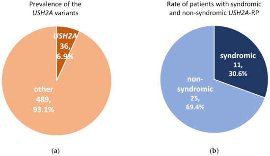 Prevalence of pathogenic variants in USH2A and rate of syndromic and non-syndromic USH2A-retinisis pigmentosa (RP) patients. (a) Pathogenic USH2A variants were detected in 36 of 525 RP cases. (b) There were 11 syndromic and 25 non-syndromic USH2A-RP patients in this study.