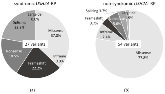 Frequency of each type of USH2A variant in this study. (a) Frequency of 6 types of 27 USH2A variants in syndromic USH2A-RP patients (n = 11). (b) Frequency of 6 types of 54 USH2A variants in non-syndromic USH2A-RP patients (n = 25).