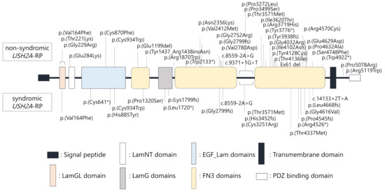 Locations of each variant in the USH2A protein structure were schematically presented (Figure 3). Notably, USH2A variants were similarly found throughout entire regions of the USH2A protein structure in non-syndromic and syndromic USH2A-RP cases, suggesting that localization of variants does not correlate with hearing loss in USH2A-RP.