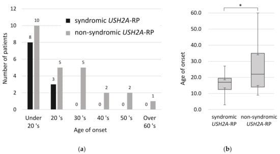 In order to understand clinical features between syndromic and non-syndromic USH2A-RP, age of disease onset was examined. All syndromic RP patients were aware of symptoms related to RP such as night blindness and constriction of visual field by their third decade of life (Figure 4a). Comparing the onset age of RP in 11 syndromic and 25 non-syndromic USH2A-RP patients, syndromic RP patients were aware of symptoms significantly earlier than non-syndromic patients (p < 0.05) (Figure 4b). The mean age of onset was 16.1 and 26.5 years old in syndromic and non- syndromic USH2A-RP patients, respectively.