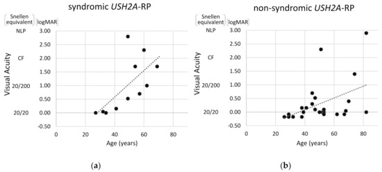 Next, visual acuity and degrees of visual field constriction were compared between syndromic and non-syndromic USH2A-RP cases. As shown in Figure 5, the correlation between age and visual acuity was more pronounced in syndromic USH2A-RP patients than in non-syndromic USH2A-RP patients. These data also indicate that a decline in visual acuity is more rapid in syndromic USH2A-RP cases than non-syndromic USH2A-RP cases.