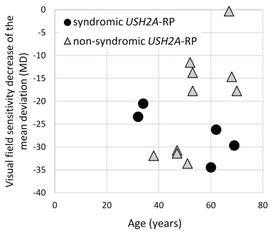 All syndromic USH2A-RP patients in this cohort noticed their symptoms by their age of 30. The mean age at which our patients noticed symptoms, such as night blindness and visual constriction, was 16.1 years old in syndromic USH2A-RP patients and 26.5 years old in non-syndromic USH2A-RP patients, revealing that the onset of RP was significantly earlier in syndromic patients than in non-syndromic patients (p < 0.05). This trend has also been reported in previous reports of other ethnic groups [23]. In addition, not only age of onset but also RP symptoms were more severe in syndromic patients than in non-syndromic patients. A rapid decline in visual acuity was observed in syndromic USH2A-RP patients as compared to non-syndromic USH2A-RP patients whose acuity was reasonably well-maintained by their 70s. Although the data did not track changes in each patient over a long time, poorer visual acuity prognosis in syndromic USH2A-RP than non-syndromic USH2A-RP cases agreed with a trend in previous studies [22,23]. Similarly, as for visual acuity, syndromic USH2A-RP patients suffered more severe visual field constriction than non-syndromic USH2A-RP patients. In non-syndromic USH2A-RP patients, the rate of MD changes was approximately −0.5 (dB/year), which is the average reported progression rate of RP [27]. In contrast with non-syndromic USH2A-RP patients, one of our syndromic USH2A-RP patients showed the value of −1.5 (dB/year). In our clinic, the Goldmann perimetry is the first-choice visual field test for patients with low vision (lower than 1.0 of logMAR visual acuity), which was more preferably conducted in our syndromic USH2A-RP patients. Indeed 5 of 11 syndromic USH2A-RP patients had difficulty performing visual field tests with HFA due to their severely affected vision. These observations in visual acuity and visual field suggest that eye symptoms of USH2A-RP are more severe in patients with syndromic USH2A-RP than those with non-syndromic USH2A-RP.