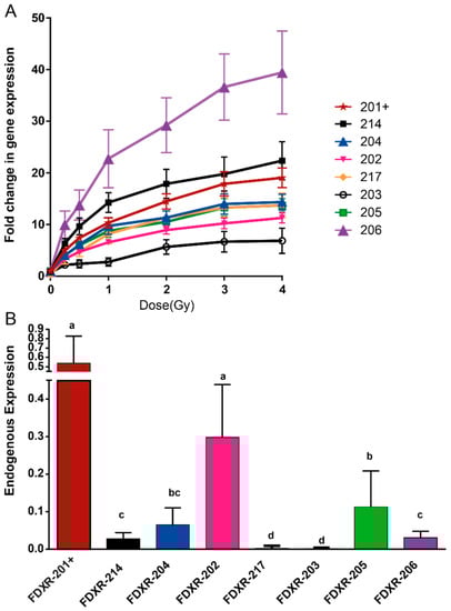 Besides, looking at the early transcriptional response, all the variants were significantly upregulated after 2 h after 2 Gy exposure apart from FDXR-203 and FDXR-217.