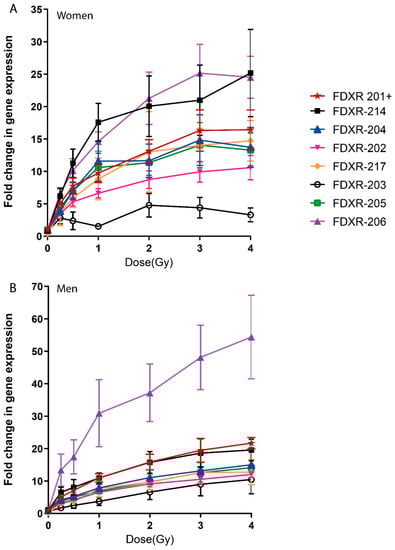 Comparisons of the radiation response of the different variants in women indicated that although variant FDXR-206 and FDXR-214 show higher fold changes, there are no significant differences with the rest of the variants except for FDXR-203 (Figure 2A). However, in men, variant FDXR-206 was significantly most responsive than the other variants for doses between 1–4 Gy (Figure 2B).