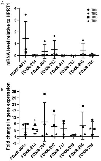 The expression profiles of the different FDXR variants were then analysed in vivo in blood samples of TBI patients before and after irradiation (Figure 4). The basal levels of expression of the different variants showed variability between patients possibly reflecting the condition of these leukaemia patients (Figure 4A). The variants presenting a highest trend of expression at basal level were FDXR-202, 205, and 204 although this is mainly driven by one patient, and the lowest was FDXR-217 and FDXR-203, as previously observed ex vivo, even though there were no significant differences between them. After IR exposure, overall, the highest fold of change in expression was 10.1-fold for FDXR-204 (see Supplementary Table S5), although the up-regulation was not found to be significant due to the large inter-individual variability in response in these patients. The most responsive variants to radiation were variant FDXR-206 for patient TBI1 and TBI4, FDXR-204 TBI3 while TBI2 hardly showed any up-regulation apart from FDXR-214, although it is weak (Figure 4B). The only variant which presented a consistent and significant upregulation was variant 214 (Figure 4B and Supplementary Table S5).