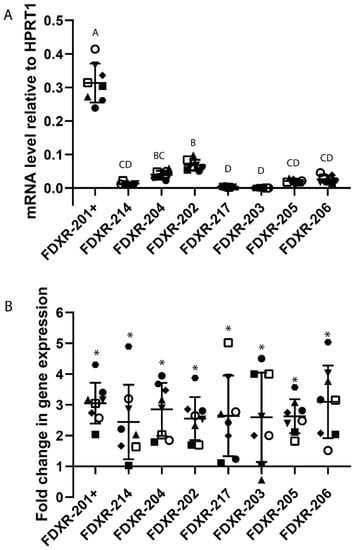 At basal level, variant FDXR-202 was the second highest expressed after FDXR-201+ mRNAs, whose primers include all the other variants (Supplementary Table S2 and Figure 5A).