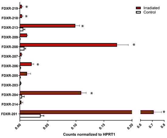 In order to obtain enough polyA+ mRNA, long read nanopore sequencing data were generated using PBMCs from three healthy donors per replicate (total of nine donors for three experiments), either sham or 2 Gy exposed. Sequencing analysis identified 12 FDXR variants (Supplementary Table S7), six of them FDXR-207, FDXR-208, FDXR-209, FDXR-213, FDXR-218, and FDXR-219 not previously characterised by qPCR. Amongst them, seven variants presented a significant response to IR, FDXR-201 as expected and FDXR-204, FDXR-206, FDXR-208, FDXR-213, FDXR-218, and FDXR-219 (Figure 6). Amongst the seven, FDXR-206, FDXR-218, and FDXR-219 were very low expressed while FDXR-218 and FDXR-219 remarkably showed an undetectable endogenous levels (no counts presented in the control sample), even after generating over 50 million reads of mRNA per sample [28] (Figure 6).