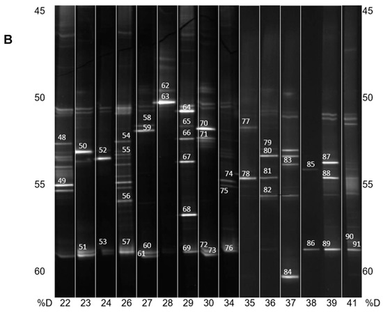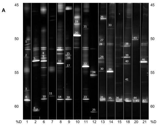 (A) PCR-DGGE analysis of isolated PBAT-degrading consortia. The numbers on the bottom represent the soil samples from Table 1. Identified bands are numbered, and their taxonomical assignation can also be found in Table 1. %D: the percentage of denaturation agent in the gradient gel; (B) Continuation of (A).