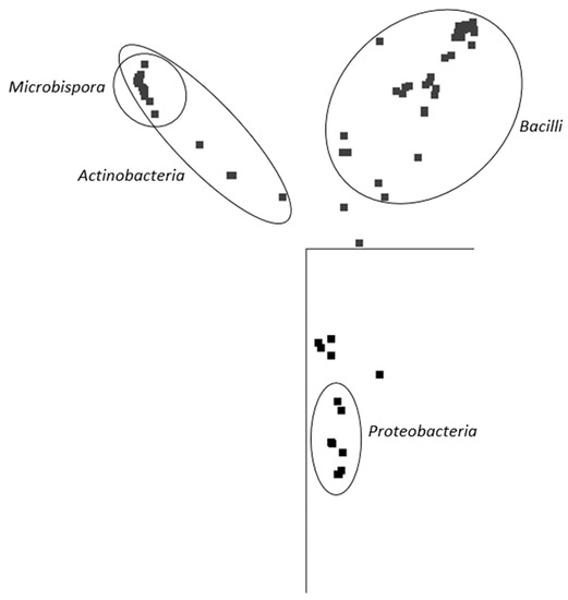 In general, and with some simplification, a band in the gel represents a bacterial species, and its intensity is roughly proportional to its abundance in the consortium. It is evident that in the majority of PBAT-degrading consortia, at least one signal could be assigned to some actinomycete strain (most often Thermobispora bispora). Signals from this species tended to show at the bottom of the gel because of the very high GC content of their DNA, which is typical for actinobacteria. In some other consortia (consortia 22 and 36), such signals were also clearly visible but were not successfully sequenced and hence could not be positively identified. Therefore, Thermobispora bispora appears to be a prominent thermophilic PBAT degrader broadly distributed in soils, at least in the studied area. Among the signals other than those of Thermobispora bispora, bands belonging to various thermophilic bacilli were dominant in the consortia, with Geobacillus as the most frequent genera. This is not entirely surprising because this group is generally highly present in soils and members of the group are often thermotolerant or thermophilic. Other bacterial groups were scarcely distributed and identified among the isolated consortia, namely proteobacteria. By evaluating the random nature of the proteobacteria members present, it was suggested that these bacteria are either present accidentally or opportunistically to exploit polymer degradation products left by actinobacteria and bacilli. With the help of principal component analysis (PCA), the retrieved sequences could be clustered into three general groups, as seen in Figure 3. It is evident that actinomycetes, and particularly Thermobispora bispora and various bacilli, represented the most distinct clusters and comprised the majority of the identified microorganisms.