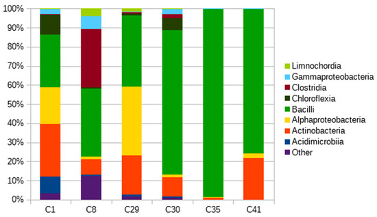 Six selected polymer-degrading microbial consortia isolated from soils belonging to three of the most common soil types included in the study (luvisol, fluvisol, and chernozem) and four habitats (field, stream bank, orchard, and grass cover) [37] were also analyzed using next generation sequencing (NGS). NGS helped to obtain quantitative data describing the composition of the microbial consortia at a higher taxonomical level (Class, Figure 4). Bacilli were the prevailing class, followed by actinobacteria and alphaproteobacteria. Bacilli accounted for the majority of identified sequences in all consortia, but were especially dominant in the consortia derived from field soils under intensive agricultural management (99% of bacilli in consortium C35), reflecting a possibly lower diversity of the microbial community in these soils [38]. Consortia C1, C8, and C29 reflected much higher diversity, but bacilli and actinobacteria are strongly present. It can also be noted that these consortia originated from the sites with more diverse plant cover. Actinobacteria were detected in all consortia, with prevalence ranging from 8% to 27%. However, in consortia C35, only 1% of actinobacteria were present, and all other bacterial taxonomical classes were well under 1%. These findings support our theory about the importance of actinobacteria in PBAT biodegradation.