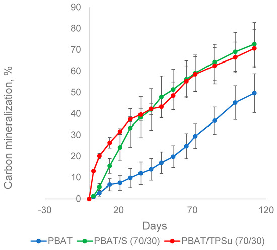 In addition to the film made of PBAT alone, blended films containing 30% powder or thermoplastic starch were also investigated, representing the most commercially available types of these materials. The materials were incubated in the presence of the mature compost at 58 °C for about 100 days, and their biodegradation was monitored by the measurement of CO2 (Figure 5). PBAT/TPSu urea (TPSu, thermoplastic starch with urea as plasticizer) degradation was fastest during the first 35 days of incubation, without or with a very short lag phase. This was probably caused by the fast mineralization of the low molecular weight plasticizers and a more loose structure of the thermoplasticized starch [39]. The PBAT/starch blend was mineralized faster than pure PBAT in the beginning, reflecting the easy decomposition of the starch component. However, from about day 40, the slopes of all curves were quasi identical. Both blends reached around 70% mineralization at the end of the experiment (112 days); PBAT film mineralization was about 50%. It seems that the TPS and starch in the blend with PBAT did not accelerate pure PBAT biodegradation under simulated industrial composting conditions; microorganisms probably just preferably consumed the easily degradable components first. PBAT was decomposed only when starch or TPS were no longer available in the blends.