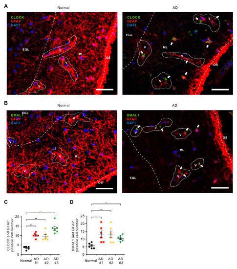 The levels of circadian locomotor output cycles kaput (CLOCK) and brain muscle ARNT-like1 (BMAL1) are elevated in impaired astrocytes in cerebral cortex region from patients with Alzheimer’s disease (AD). (A) Representative immunofluorescence images of CLOCK expression in cerebral cortex region from patients with AD (AD) or non-AD (normal) showing CLOCK (green) in astrocytes expressing the astrocytes marker GFAP (red) around blood vessels (V) (n = 3 per group, n = 6 images per individual subject). DAPI-stained nuclei are shown in blue. Outer surface (OS); molecular layer (ML); external granular layer (EGL). Scale bars, 20 μm. (B) Representative immunofluorescence images of BMAL1 expression in cerebral cortex region from patients with AD (AD) or non-AD (normal) showing BMAL1 (green) in astrocytes expressing the astrocytes’ marker GFAP (red) around blood vessels (V) (n = 3 per group, n = 6 images per individual subject). DAPI-stained nuclei are shown in blue. Outer surface (OS); molecular layer (ML); external granular layer (EGL). Scale bars, 20 μm. DAPI-stained nuclei are shown in blue. (C) Quantification of CLOCK positive astrocytes from immunofluorescence images in cerebral cortex region from patients with AD (AD) or non-AD (normal) (n = 3 per group, n = 6 images per individual subject). Data are mean ± standard deviation (SD). **, p < 0.01 by Student’s two-tailed t-test. (D) Quantification of BMAL1 positive astrocytes from immunofluorescence images in cerebral cortex region from patients with AD (AD) or non-AD (normal) (n = 3 per group, n = 6 images per individual subject). Data are mean ± standard deviation (SD). Symbols, which are expressed by white dotted line, indicate the outline of BBB. **, p < 0.01 by Student’s two-tailed t-test.