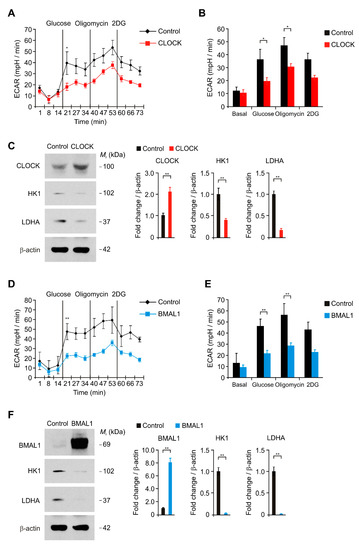 The elevation of CLOCK and BMAL1 suppresses aerobic glycolysis and lactate production by reduction in hexokinase 1 (HK1) and lactate dehydrogenase A (LDHA) protein levels in human astrocytes. (A) The levels of extracellular acidification rate (ECAR) for glycolysis of glucose and (B) quantification of ECAR levels in control and CLOCK-overexpressing (CLOCK) human astrocytes. Data are representative of three independent experiments. Data are mean ± SEM. * p < 0.05 using the two-tailed Student’s t-test. (C) Representative immunoblot analysis for CLOCK, HK1, LDHA (left) and quantification for CLOCK, HK1, LDHA protein levels (right) in control and CLOCK-overexpressing (CLOCK) human astrocytes. For immunoblots, β-actin was used as loading control. Data are representative of three independent experiments. Data are mean ± SEM. ** p < 0.01 using the two-tailed Student’s t-test. (D) The levels of extracellular acidification rate (ECAR) for glycolysis of glucose and (E) quantification of ECAR levels in control and BMAL1-overexpressing (BMAL1) human astrocytes. Data are representative of three independent experiments. Data are mean ± SEM. * p < 0.05 using the two-tailed Student’s t-test. (F) Representative immunoblot analysis for BMAL1, HK1, LDHA (left) and quantification for BMAL1, HK1, LDHA protein levels (right) in control and BMAL1-overexpressing (BMAL1) human astrocytes. For immunoblots, β-actin was used as loading control. Data are representative of three independent experiments. Data are mean ± SEM. ** p < 0.01 using the two-tailed Student’s t-test.