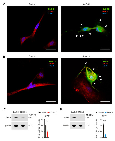 The elevation of CLOCK and BMAL1 contributes to the functional impairment by reduction in GFAP-positive filaments in human astrocytes. (A) Representative immunofluorescence images of CLOCK expression in control and CLOCK-overexpressing (CLOCK) human astrocytes showing CLOCK (green) and GFAP (red) (n = 10 per group). DAPI-stained nuclei are shown in blue. The shortness and shrinkage of GFAP-positive filaments were indicated (white arrows). Scale bars, 20 μm. (B) Representative immunofluorescence images of BMAL1 expression in control and BMAL1-overexpressing (BMAL1) human astrocytes showing BMAL1 (green) and GFAP (red) (n = 10 per group). DAPI-stained nuclei are shown in blue. The shortness and shrinkage of GFAP-positive filaments were indicated (white arrows). Scale bars, 20 μm. (C) Representative immunoblot analysis for GFAP (left) and quantification for GFAP protein levels (right) in control and CLOCK-overexpressing (CLOCK) human astrocytes. For immunoblots, β-actin was used as loading control. Data are representative of three independent experiments. Data are mean ± SEM. * p < 0.05 using the two-tailed Student’s t-test. (D) Representative immunoblot analysis for GFAP (left) and quantification for GFAP protein levels (right) in control and BMAL1-overexpressing (BMAL1) human astrocytes. For immunoblots, β-actin was used as loading control. Data are representative of three independent experiments. Data are mean ± SEM. * p < 0.05, ** p < 0.01 using the two-tailed Student’s t-test.