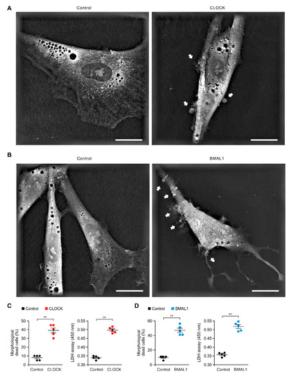 The elevation of CLOCK and BMAL1 induces cytotoxicity in human astrocytes. (A) Representative 3D images of control and CLOCK-overexpressing (CLOCK) human astrocytes (n = 10 images per group). The morphological features of cytotoxicity were indicated (white arrows). Scale bars, 20 μm. (B) Representative 3D images of control and BMAL1-overexpressing (BMAL1) human astrocytes (n = 10 images per group). The morphological features of cytotoxicity were indicated (white arrows). Scale bars, 20 μm. (C) Quantification of the morphological dead cells (left) in control and CLOCK-overexpressing (CLOCK) human astrocytes (the percent of morphological dead cells in total 100 cells in 10 individual images per group). Cytotoxicity assay (right) in control and CLOCK-overexpressing (CLOCK) human astrocytes using lactate dehydrogenase (LDH) levels. Data are representative of three independent experiments, and each was performed in triplicate. Data are mean ± SEM. ** p < 0.01 using the two-tailed Student’s t-test. (D) Quantification of the morphological dead cells (left) in control and BMAL1-overexpressing (BMAL1) human astrocytes (the percent of morphological dead cells in total 100 cells in 10 individual images per group). Cytotoxicity assay (right) in control and BMAL1-overexpressing (BMAL1) human astrocytes using lactate dehydrogenase (LDH) levels. Data are representative of three independent experiments, and each was performed in triplicate. Data are mean ± SEM. ** p < 0.01 using the two-tailed Student’s t-test.