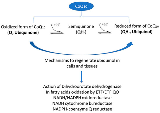 Among all the functions attributed to CoQ10 mentioned above, the most important and relevant of its actions is the potent antioxidant capability of its coexistent redox forms (ubiquinone, semi-ubiquinone, and ubiquinol), which act in the mitochondrial membrane, as well as in other membranes in the cell and in the plasma and cytoplasm. These antioxidant properties in the electron transport chain in the mitochondria enhance the efficiency of the electron transport, preventing the loss of uncontrolled electrons, help to recycle other antioxidants such as vitamin C or vitamin E, and directly act on free radicals or oxidants, reducing and neutralizing the compounds. The capability of CoQ10 to exchange electrons one-by-one as it converts between the three redox forms makes these antioxidant actions possible. Presumably, the reduced form of CoQ10, ubiquinol, is the active agent involved in the antioxidant function, so the cells and tissues must have molecular mechanisms by which they recover their active form. Briefly, these mechanisms include the action of dihydroorotate dehydrogenase in the inner mitochondrial membrane, which is involved in pyrimidine biosynthesis and reduces ubiquinone by the oxidation of dihydroorotate to orotate, and the involvement of CoQ10 in the flavoprotein/electron transfer of flavoprotein:ubiquinone in the oxidoreductase system, which enables the ubiquinol to recover by participating in the oxidation of the fatty acids. Here, CoQ10 is kept in equilibrium between its redox forms outside the mitochondria by the actions of three enzymes: nicotinamide adenine dinucleotide reduced/nicotinamide adenine dinucleotide phosphate (NADH/NADPH) reduced oxidoreductase, NADH cytochrome b5 reductase, and NADPH-coenzyme Q reductase (Figure 1) [6,7,8]. CoQ10 has a ubiquitous location and is present in all the membranes of the cell. The major source of CoQ10 comes from its endogenous biosynthesis, which occurs in all the tissues of an organism, although a minor proportion of CoQ10 derives from dietary sources. However, from a clinical point of view, it is important to note that endogenous production deficiency has been reported in the pathophysiology of different diseases, and that aging is associated with a major level of decay.