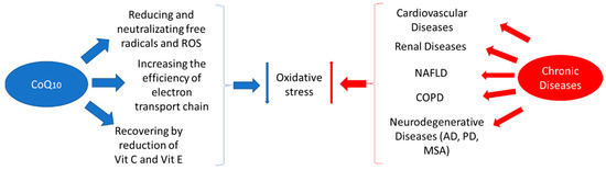 Coenzyme Q10 mechanisms against oxidative stress associated with chronic disease. CoQ10: Coenzyme Q10; Vit C: vitamin C; Vit E: vitamin E; NAFLD: non-alcoholic fatty liver disease; COPD: chronic obstructive pulmonary disease; AD: Alzheimer’s disease; PD: Parkinson’s disease; MSA: multiple system atrophy.