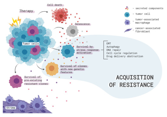 A tumor is a heterogeneous population of cells that changes significantly after exposure to drug therapy. Also, the tumor cells are in constant dynamic interaction with stromal and immune cells, as well as with other subpopulations of cancer cells. The therapeutic effect not only creates selective pressure but also changes the nature of intercellular communication, providing conditions for better survival of the remaining tumor cells [13,14]. In this review, we take a detailed look at the complex interplay of different processes that are activated in tumors and their microenvironment in response to chemo- and radiotherapy.