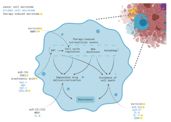 The role of the therapy-induced intra- and intercellular events in the acquisition of cancer cell resistance. Stress caused by anticancer therapy triggers many events (acquisition of new mutations, changes in the regulation of the cell cycle, EMT, autophagy) which then leads to avoidance of cell death and a change in the efficiency of absorption/activation of the chemotherapy drug. In addition to intracellular signals, molecules from stromal cells, as well as other tumor cells, entering the cell from outside are involved in the induction of these events. Molecules of therapy-induced secretomes are marked by asterisks; molecules secreted from cancer cells are marked in black; molecules secreted from stromal cells are marked in blue.