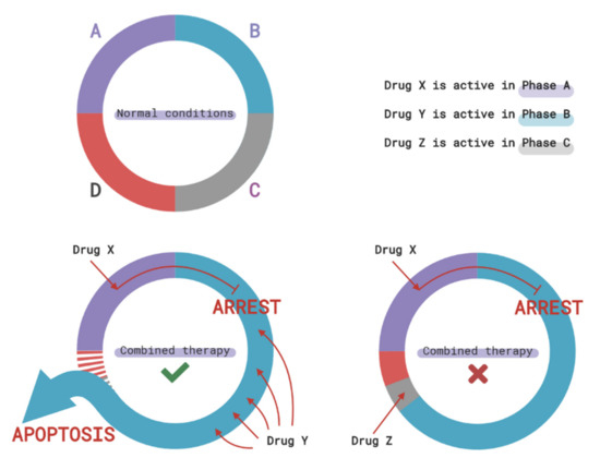 The success of combined therapy depends on the cell cycle. The use of chemotherapeutic drugs that depend on the phase of the cell cycle and cause its arrest may lead to both higher and lower effectiveness of the combined therapy. Arresting the cell cycle in a phase corresponding to the maximum effectiveness of the second drug prolongs its time of action. Arresting the cell cycle in a phase preceding the action of the second drug impairs its effects. A, B, C, and D represent 4 phases of the cell cycle.
