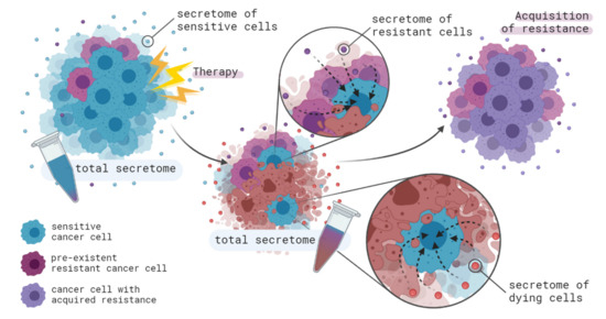 Therapy-sensitive and therapy-resistant tumor cells are known to secrete significantly different sets of signaling molecules [159,160,161,162,163,164,165]. Using cell models of breast cancer [166,167,168,169,170,171], ovarian cancer [172,173], prostate cancer [174], melanoma [175,176], acute lymphoblastic leukemia [177], acute myeloid leukemia [178], colorectal cancer [179], esophageal cancer [180], non-small cell lung cancer [181], osteosarcoma [182], and renal cell carcinoma [183] therapy-resistant tumor cells were shown to release a number of molecules into the extracellular space, which contributes to the acquisition of resistance in more sensitive tumor cells.