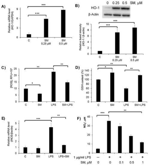 2.2. Effects of SM on Cellular Redox Imbalance and NO Production in RAW 264.7 Macrophages