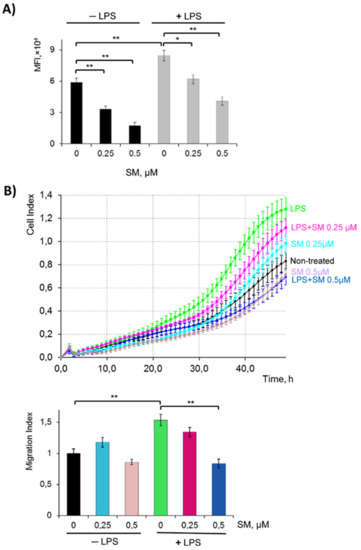 2.3. SM Inhibits the Phagocytic and Migratory Activity of Macrophages