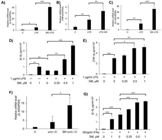 2.4. Effect of SM on Pro-Inflammatory Cytokines in LPS, Poly(I:C), and IFN-γ-Stimulated RAW 264.7 Cells