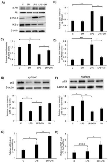 2.5. Effect of SM on the Activation of the Akt, NF-κB, and AP-1 Signaling Pathways and TLR4 in LPS-Induced RAW264.7 Cells