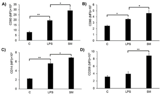 2.6. Effects of SM on Macrophage Surface Marker Expression