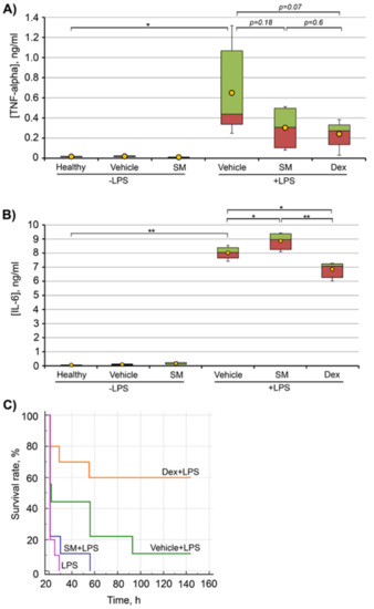 - Kosyreva, A.M.; Makarova, O.V.; Kakturskiy, L.V.; Mikhailova, L.P.; Boltovskaya, M.N.; Rogov, K.A. Sex differences of inflammation in target organs, induced by intraperitoneal injection of lipopolysaccharide, depend on its dose. J. Inflamm. Res. 2018, 11, 431–445. [Google Scholar] [CrossRef]