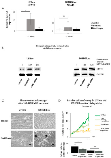 NFAT5 mRNA, protein expression and cell growth in unaffected and DMD fibroblasts exposed to hyperosmolar or pro-inflammatory stress. Normal NFAT5 physiology in unaffected fibroblasts induce delayed cell growth when exposed to pro-inflammatory stress (DMEMCyto) (p < 0.01) (A–D), whereas abnormal NFAT5 physiology in DMD fibroblasts leads to cell detachment in hyperosmolar medium (DMEM60) and unaffected cell growth under pro-inflammatory setting (DMEMCyto) (A–D). * p < 0.05, ** p < 0.01, ns indicates no significance.