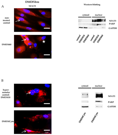 Nuclear factor of activated T-cells 5 (NFAT5) physiology in unaffected fibroblasts exposed to hyperosmolar or pro-inflammatory stress. In red, localization of NFAT5 is visualized. Myonuclei are stained with DAPI (blue) (n = 3). NFAT5 translocates to the nucleus in unaffected fibroblasts exposed to hyperosmolar stress, as indicated by the white arrows (DMEM60) (A) and remains in the cytoplasm under pro-inflammatory stimulation (DMEMCyto) (B). A hyperosmolar control (DMEM18) was used in B to study the effect of DMEMCyto only.