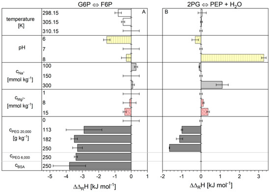 ITC is a special calorimetric method that combines the addition of substrates or enzymes with minimal thermal disturbances with the real-time tracking of the reaction progress in µW ranges. It offers the advantage of providing both the thermodynamic state variable reaction enthalpy change and kinetic parameters. In this work, the reactions of F6P to G6P and PEP to 2PG (for practical reasons the opposite direction of the glycolysis) were measured and evaluated. For both reactions, the reaction enthalpy change was determined with Equation (3) (Section 4). The values for the total reaction heat Q were measured using ITC and the equilibrium ratio values were obtained using ePC-SAFT. The reaction enthalpy changes for reactions 2 and 9 are given in Tables S3 and S4 in the supplementary materials. For reasons of clarity, Figure 1 shows the deviations from the reaction enthalpy change under conditions, named basic conditions, where the reaction enthalpy changes of 11.1 ± 0.5 kJ mol−1 for reaction 2 and 2.4 ± 0.1 kJ mol−1 for reaction 9 were obtained. “Basic conditions” are considered as reference states and are defined in detail in the Section 4.