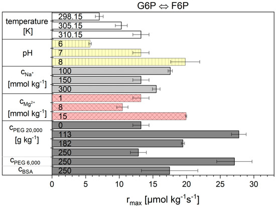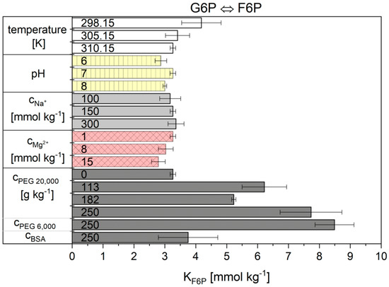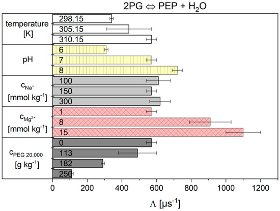 The influence of all tested cytosolic conditions on the parameters and Λ from Equation (12) of the Noor Model are given in Figure 5 and Figure 6 and numerically in Table S6 in supplementary materials. Dependencies on temperature, pH, magnesium ions and crowding were observed. The concentration of sodium ions had no influence. The values obtained for reaction 9 from the Noor model have great difficulty in producing significant values under some conditions. At pH 6 and 182 g kg−1 PEG 20,000, the error bars are very large. At 15 mmol kg−1 Mg2+ and 250 g kg−1 PEG 20,000 the values are not statistically relevant. But the main problem with the Noor Model was that two parameters can compensate each other and thus make a clear description of the cytosolic influence difficult. Therefore, only the flux-force model is used in the following.