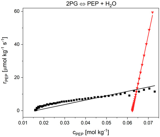 Therefore, ITC reaction monitoring and models from irreversible thermodynamics (Noor and flux-force) have been combined in this work. As reversible model reactions, the reactions 2 (uni-uni mechanism) and 9 (uni-bi mechanism) of glycolysis were investigated. Reaction 2 is the isomerization of glucose 6-phosphate (G6P) to fructose 6-phosphate (F6P) by the enzyme phosphoglucose isomerase, Equation (1). Reaction 9 is the conversion of 2-phosphoglycerate (2PG) to phoshoenolpyruvate (PEP) and water by enolase, Equation (2).