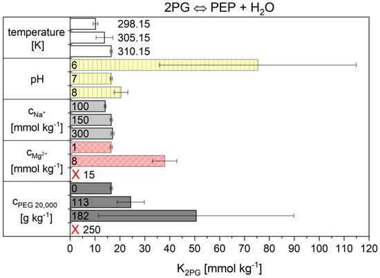 - Vogel, K.; Greinert, T.; Harms, H.; Sadowski, G.; Held, C.; Maskow, T. Influence of cytosolic conditions on the reaction equilibrium and the reaction enthalpy of the enolase reaction accessed by calorimetry and van ‘t HOFF. Biochim. Biophys. Acta (BBA) Gen. Subj. 2020, 1864, 129675. [Google Scholar] [CrossRef]