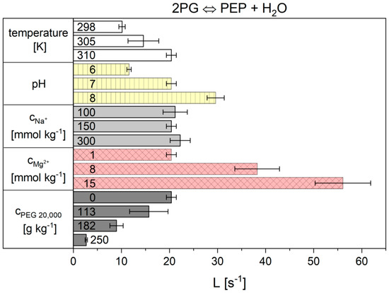 The overall results for all individual cytosolic conditions (temperature, pH, concentrations of Na+, Mg2+ and crowding agent) of reaction 9 are summarized in Figure 8. L increased with the rising temperature. Similarly, the pH value influenced the reaction kinetics, since a pH increase to pH 8 led to an increase in the L parameter. The concentration of sodium ions had no statistically significant influence on L. In contrast, the concentration of magnesium ions strongly influenced L. By increasing the Mg2+ concentration, the value of L increased considerably, which corresponds to a dramatic increase in the reaction rate. The exact opposite was observed when crowding agents were added. Addition of PEG 20,000 as a crowding agent led to a dramatic reduction of L and thus to a strong decrease in the reaction rate. The exact values and errors resulting from the triple determination are given in supplementary materials (Table S8).