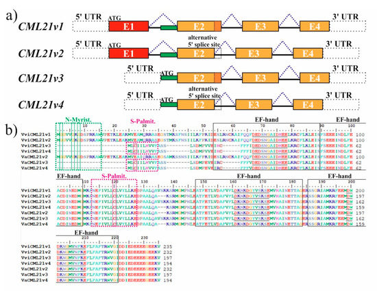 The structure representation and protein sequence analysis of CML21 mRNA splice variants in grapevine. (a) Alternatively spliced CML21 transcript variants of Vitis amurensis identified in this work (VaCML21v2, VaCML21v3, VaCML21v4) and CML21 transcript variants of Vitis vinifera (VviCML21v1, VviCML21v2, VviCML21v3, VviCML21v4) predicted by genome sequence analysis and retrieved from the databases. Exons and introns are shown using boxes and lines, respectively, with white dashed boxes representing untranslated regions (UTRs). (b) Alignment and conserved motif analysis of CML21 deduced proteins in V. amurensis and V. vinifera. The EF hands were predicted by PROSITE scan [31,32] and the lipid modification sites were predicted using GPS-Lipid [33,34]. Multiple sequence alignment was conducted using BioEdit software [35].