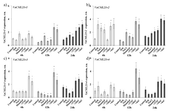Expression analysis of VaCML21v1 (a), VaCML21v2 (b), VaCML21v3 (c), and VaCML21v4 (d) splice variants 6 h, 12 h, and 24 h post-treatment in the leaves of V. amurensis exposed to control (Control, filtered water, +25 °C), water-deficit (WD, cuttings laid on a paper towel, +25 °C), high salt (0.4 M NaCl, +25 °C), osmoticum (0.4 M mannitol, +25 °C), low temperature (+10 °C and +4 °C), and high temperature (+37 °C) abiotic stress conditions. The expression of the CMLs was profiled by quantitative real-time RT-PCR. The data are presented as the mean ± SE (three independent experiments). *, **—significantly different from the Control for each time point at p ≤ 0.05 and 0.01 according to Student’s t-test.