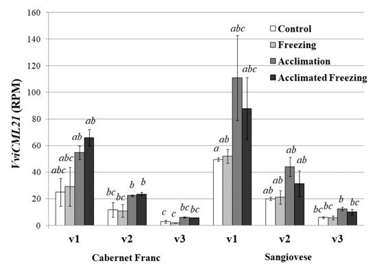 Expression levels of the CML21v1, CML21v2, and CML21v3 splice variants in Vitis vinifera in the most-damaged cultivar “Cabernet Franc” and the least-damaged cultivar “Sangiovese” cultivated under low-temperature stress conditions. The RNAseq libraries were obtained by Londo et al. [37] and analyzed in the present study for VviCML21 abundance. The V. vinifera plants were exposed to control treatment, freezing (gradual freezing to −3 °C for 45 min), acclimation or chilling (+4 °C for 48 h), and acclimated freezing (+4 °C for 48 h and −3 °C for 45 min). RPM—reads per million mapped reads. The data are presented as the mean ± SE. Means followed by the same letter were not different using one-way analysis of variance (ANOVA), followed by the Tukey HSD multiple comparison test. A value of p ≤ 0.05 was considered significant.