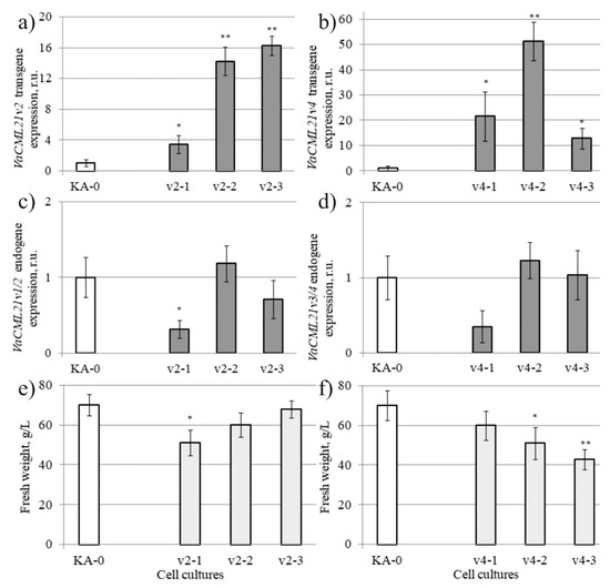 Characterization of the grapevine callus cell cultures transformed with the VaCML21v2 and VaCMLv4 splice variants. (a,b) Quantification of the VaCML21v2 and VaCML21v4 transgene mRNAs; (c,d) Quantification of the endogenous VaCML21v1/v2 and VaCML21v3/v4 mRNAs. (e,f) Fresh biomass accumulation in the VaCML21v2-transgenic and VaCML21v4-transgenic cell cultures after 30-day cultivation. v2-1, v2-2, v2-3—VaCML21v2-transformed calli; v4-1, v4-2, v4-3—VaCML21v4-transformed calli. KA-0—control cell culture transformed with the “empty” vector. The data are presented as the mean ± SE (two independent experiments). * p ≤ 0.05; ** p ≤ 0.01 versus values of VaCML21 expression in the empty vector-transformed KA-0 cell culture according to Student’s t-test.