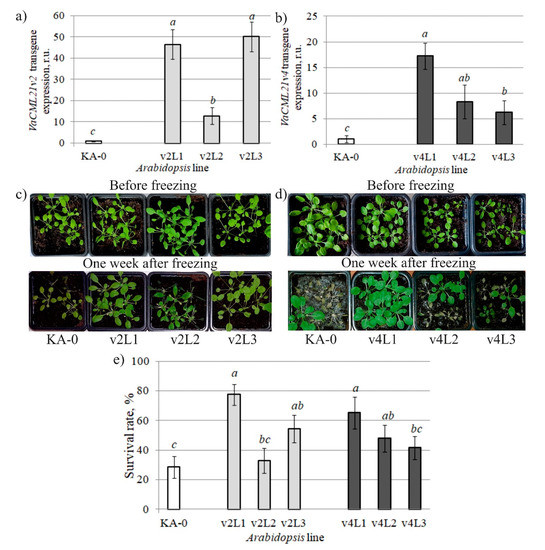 The stress tolerance assays of the transgenic A. thaliana showed that the survival rates of the 35S::VaCML21 lines were higher than the survival rates of the KA-0 control plants (Figure 5c–e). The increase in cold stress tolerance was statistically significant only for those two transgenic lines (v2L1, v2L3, v4L1, v4L2) that expressed the VaCML21v2 and VaCML21v4 splice variants at a higher level (Figure 5a,b,d).