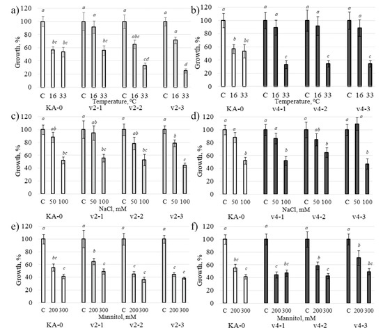 Influence of temperature (a,b), salt (c,d) and osmotic (e,f) stresses on the fresh biomass accumulation in the transgenic grapevine callus cell lines overexpressing the VaCML21v2 and VaCML21v4 splice variants. The average growth rates were assessed after 30 days of cultivation in the dark under the control (24 °C), cold stress (+16 °C), heat stress (+37 °C), salt stress (NaCl 50 and 100 mM), and high-mannitol (200 and 300 mM) conditions. v2-1, v2-2, v2-3—VaCML21v2-transformed calli; v4-1, v4-2, v4-3—VaCML21v4-transformed calli. KA-0—control cell culture transformed with the “empty” vector. The data are presented as the mean ± SE (two independent experiments with ten replicates each). Means followed by the same letter were not different using one-way analysis of variance (ANOVA), followed by the Tukey HSD multiple comparison test. A value of p ≤ 0.05 was considered as significant.
